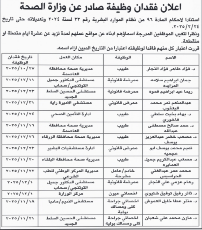 دوائر حكومية تعلن شواغر وأسماء موظفين فاقدي وظائفهم