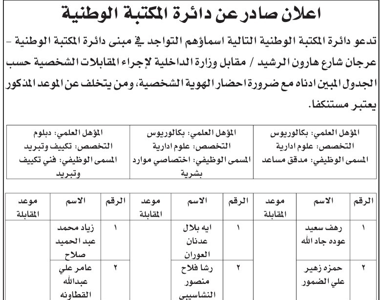 تدعو دائرة المكتبة الوطنية، اليوم الثلاثاء التالية اسماؤهم لاجراء المقابلات الشخصية.