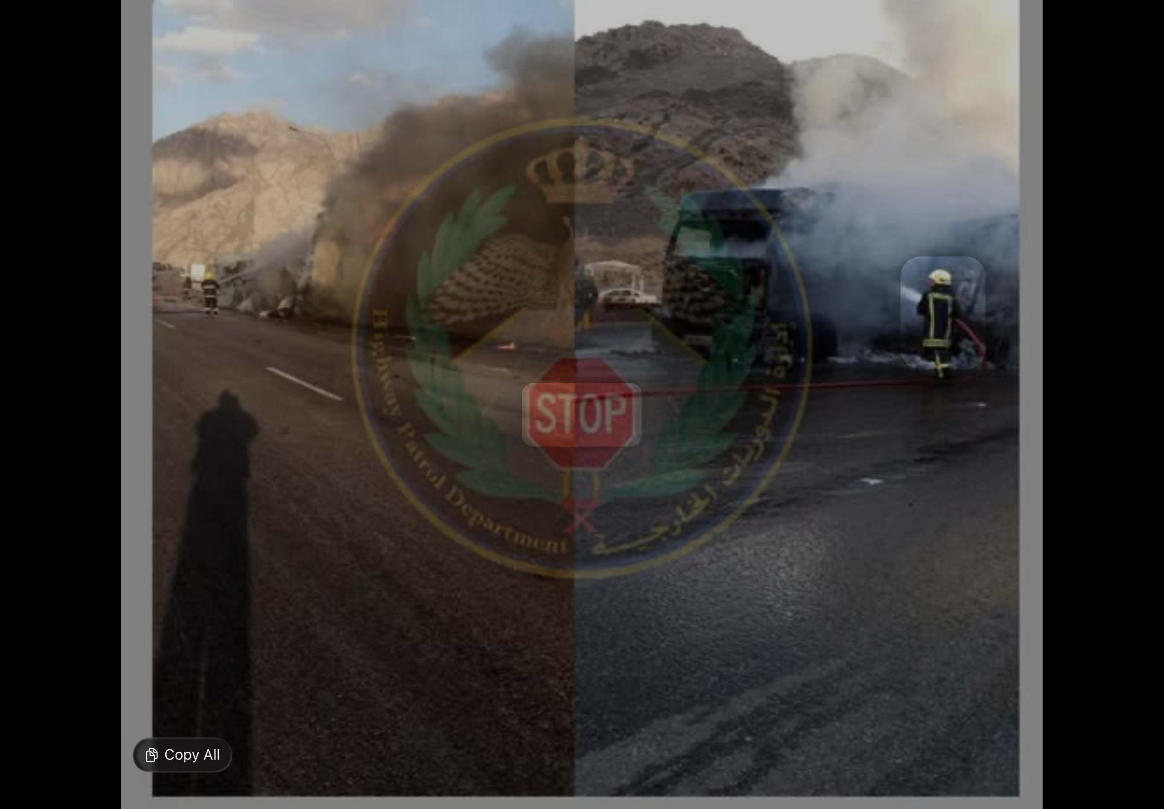 تصادم صهريج غاز وتريلا على طريق تتن–عمّان يتسبب باشتعال المركبتين وإصابة متوسطة
