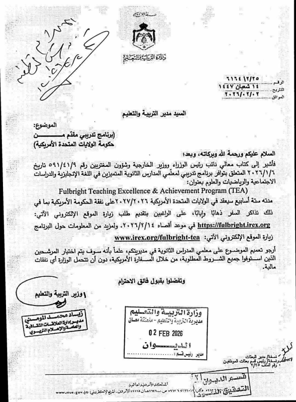أعلنت وزارة التربية والتعليم عن فتح باب الترشح لبرنامج تدريبي متقدم لمعلمي المدارس الثانوية في الأردن، ضمن برنامج Fulbright Teaching Excellence & Achievement (TEA) الممول بالكامل من الحكومة الأميركية.