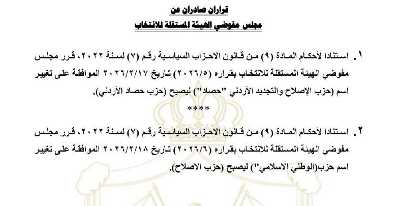 وبحسب الوثيقة، وافق المجلس في 17 شباط 2026، على تغيير اسم "حزب الإصلاح والتجديد الأردني – حصاد" ليصبح "حزب حصاد الأردني".