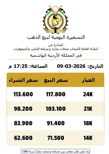 وبلغ سعر بيع الغرام الواحد من الذهب عيارات 24 و18 و14 لغايات الشراء من محالّ الصاغة، عند 117.80 و91.40 و71.50 دينارا على الترتيب.