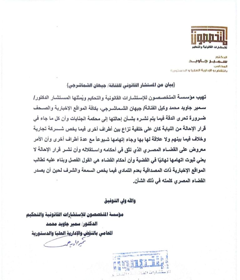 أصدرت الفنانة جيهان الشماشرجي بياناً عبر مستشارها القانوني تطالب فيه وسائل الإعلام بتحري الدقة بشأن ما يُنشر عن إحالتها للمحاكمة.