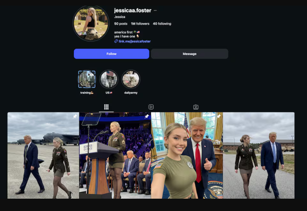 والحساب الذي يحمل اسم "jessicaa.foster" حصد مليون متابع على إنستغرام، حيث يقوم بتحويل التفاعل الهائل من الصور المزيفة مع الرئيس دونالد ترامب والتعليقات المؤيدة لحركة "MAGA" إلى حساب على منصة "OnlyFans" يبيع صورا للأقدام، حسب ما كشفته مجلتا "Fast Company" و"Marca".