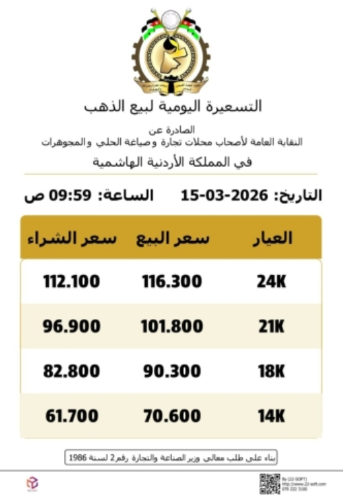 وبحسب التسعيرة، بلغ سعر بيع غرام الذهب من عيار 24 نحو 116.300 دينار، فيما سجل عيار 21 الأكثر طلباً في السوق المحلية 101.800 دينار للغرام.