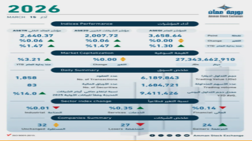 بلغ حجم التداول الإجمالي في بورصة عمان، اليوم الأحد، 6.2 مليون دينار وعدد الأسهم المتداولة 1.7 مليون سهم، نفذت من خلال 1858 عقدا.
