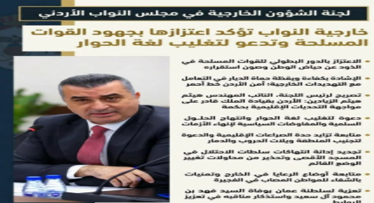 أعربت لجنة الشؤون الخارجية النيابية عن فخرها واعتزازها بالدور البطولي والمحوري الذي تضطلع به القوات المسلحة الأردنية – الجيش العربي، في الدفاع عن الوطن وصون استقراره.
