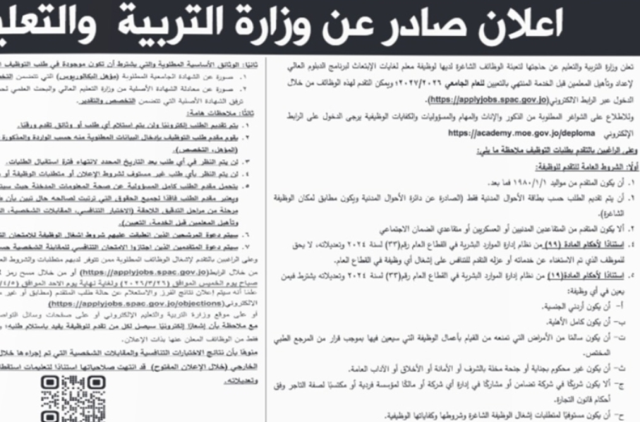 أعلنت وزارة التربية والتعليم ، اليوم الأربعاء، عن حاجتها لتعبئة وظائف شاغرة لوظيفة معلم .