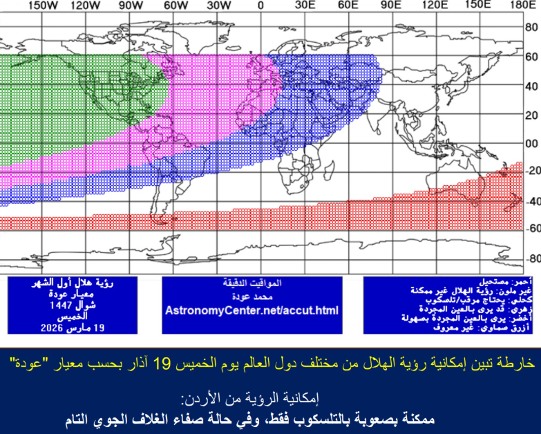 أكد رئيس الجمعية الفلكية الأردنية عمار السكجي، أن الحسابات الفلكية تشير إلى أن رصد هلال شهر شوال مساء الخميس 19 آذار الحالي، الموافق 29 رمضان 1447 هـ، سيكون "ممكنا ولكن بصعوبة"، وفقط باستخدام التلسكوبات والأجهزة البصرية المتقدمة من قبل راصدين محترفين.