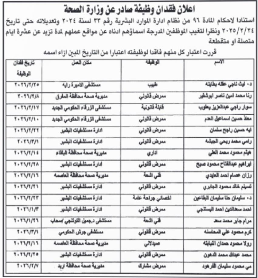 كما أعلنت وزارة الصحة عن فقدان عدد من الموظفين لوظائفهم، وذلك استناداً لأحكام المادة (96) من نظام إدارة الموارد البشرية رقم (33) لسنة 2024 وتعديلاته حتى تاريخ 24 فبراير 2025.