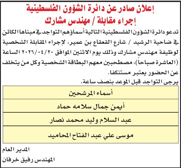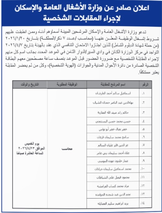 دعت دوائر حكومية، اليوم الأربعاء ، التالية أسماؤهم لإجراء المقابلات الشخصية.