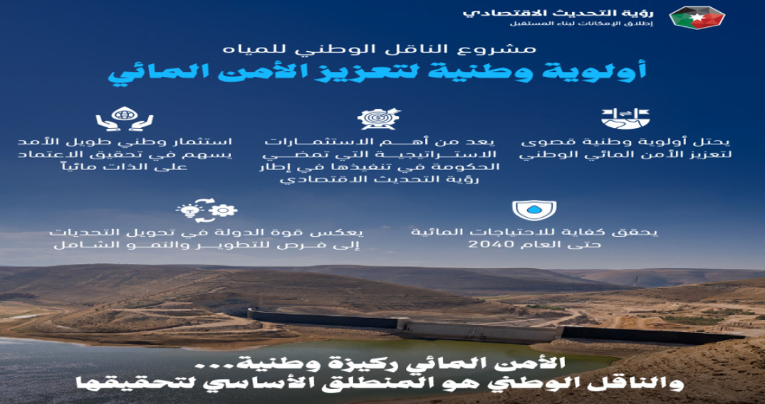 ويُعد مشروع الناقل الوطني للمياه أحد أهم المشاريع الواردة في رؤية التحديث الاقتصادي، ويحتل أولوية وطنية قصوى لتعزيز الأمن المائي الوطني.