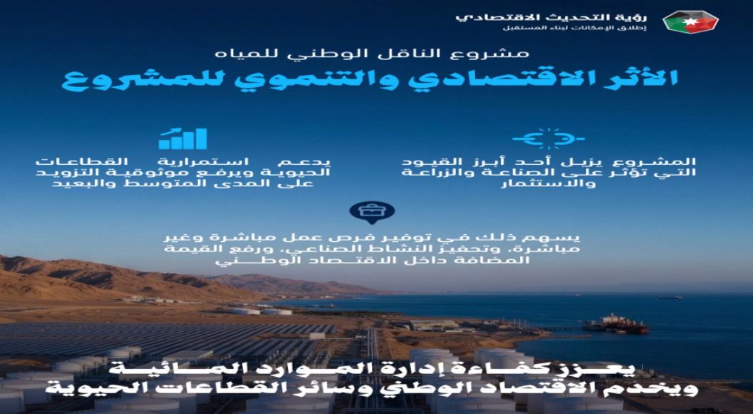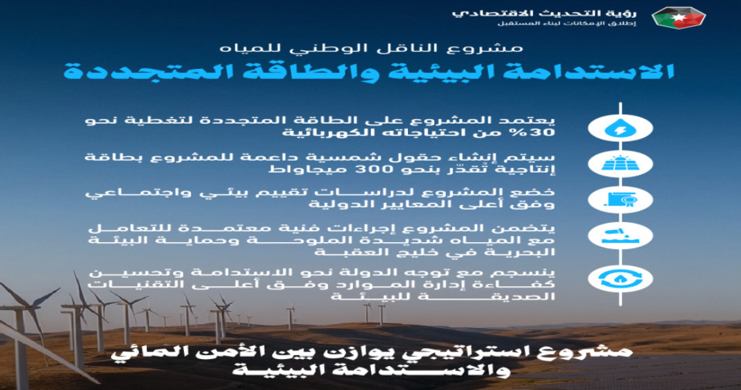 ويُعد مشروع الناقل الوطني الأردني الأول من نوعه عالمياً، إذ يدمج بين عدة ركائز استراتيجية تتمثل في: تحلية 300 مليون متر مكعب سنويا من مياه البحر، وأنظمة ضخ لارتفاعات تصل إلى 1100 متر فوق سطح البحر عبر أنابيب تمتد لنحو 450 كيلومترا، والاعتماد بشكل كبير على الطاقة المتجددة وفق أعلى التقنيات الحديثة والصديقة للبيئة.