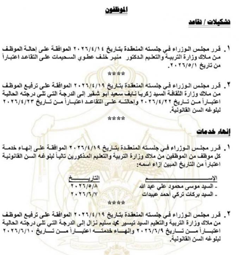 صدر في عدد الجريدة الرسمية اليوم الخميس، قرارت مجلس الوزراء بإحالة عدد من موظفي الدولة إلى التقاعد، وانهاء خدمات اخرين.