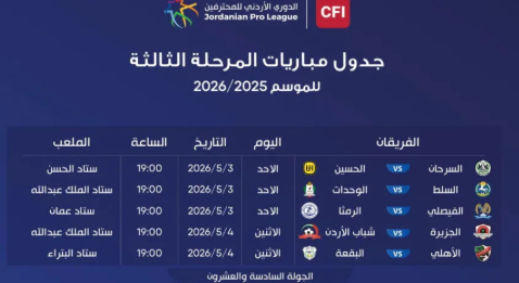 أصدر اتحاد كرة القدم، جدول مواعيد وأماكن إقامة مباريات الأسبوع الـ26 وقبل الأخير، من الدوري الأردني للمحترفين CFI لموسم 2025 / 2026.