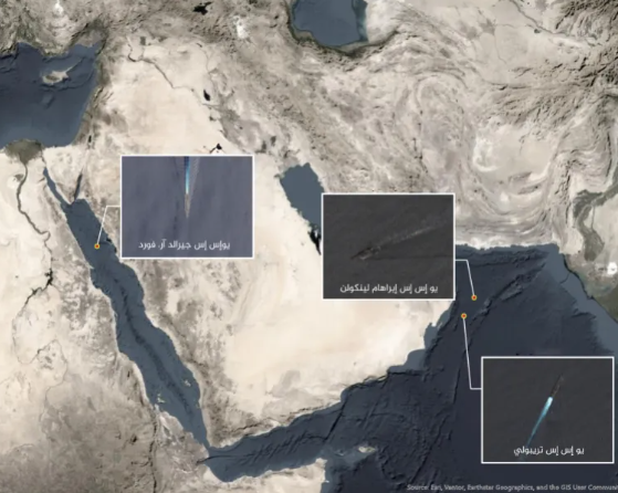 وبحسب التحليل البصري الذي أجرته وحدة المصادر المفتوحة في شبكة الجزيرة، ظهرت حاملة الطائرات الأمريكية يو إس إس جيرالد آر فورد (USS Gerald R. Ford / CVN-78) في شمال البحر الأحمر، بينما رُصدت حاملة الطائرات يو إس إس أبراهام لينكولن (USS Abraham Lincoln / CVN-72) في بحر العرب، إلى جانب سفينة الإنزال الهجومي يو إس إس تريبولي (USS Tripoli / LHA-7) في النطاق البحري نفسه.