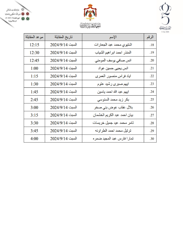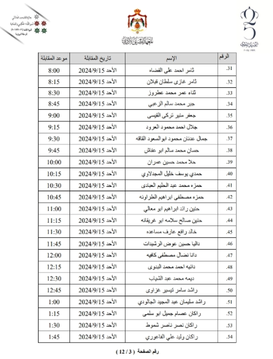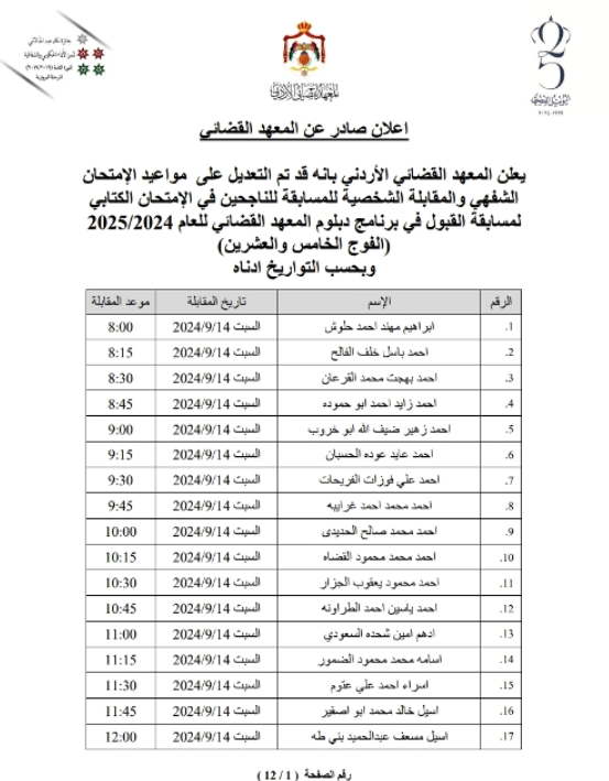 أعلن المعهد القضائي الأردني بانه قد تم التعديل على مواعيد الامتحان الشفهي والمقابلة الشخصية للمسابقة للناجحين في الامتحان الكتابي لمسابقة القبول في برنامج دبلوم المعهد القضائي للعام 2024/2025 (الفوج الخامس والعشرين).