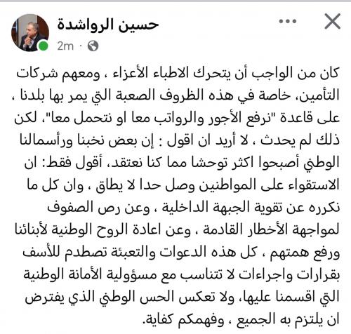 قال الكاتب السياسي حسين الرواشدة بعد الخلاف بين نقابة الأطباء الأردنيين وشركات التأمينات الصحية أنه من الواجب أن يتحرك الاطباء الأعزاء ، ومعهم شركات التأمين، خاصة في هذه الظروف الصعبة التي يمر بها بلدنا ، على قاعدة "نرفع الأجور والرواتب معا او نتحمل معا".
