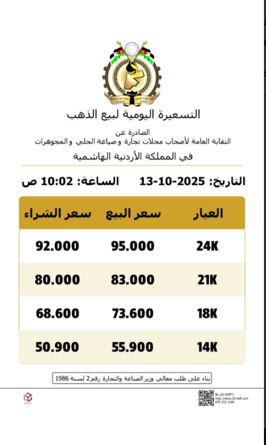 ووفقا للنشرة اليومية الصادرة عن النقابة العامة لأصحاب محلات تجارة وصياغة الحلي والمجوهرات، ارتفع سعر الغرام الواحد من الذهب لعيارات 24 و18 و14 إلى 95 دينارا و73.6 دينارا و55.9 دينار على التوالي، لغايات البيع من محلات الصياغة.